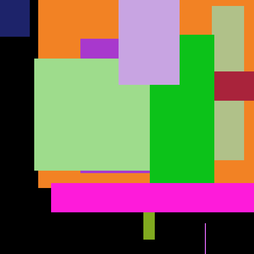 Green, black, blue, brown, mint, orange, pink, white, yellow
